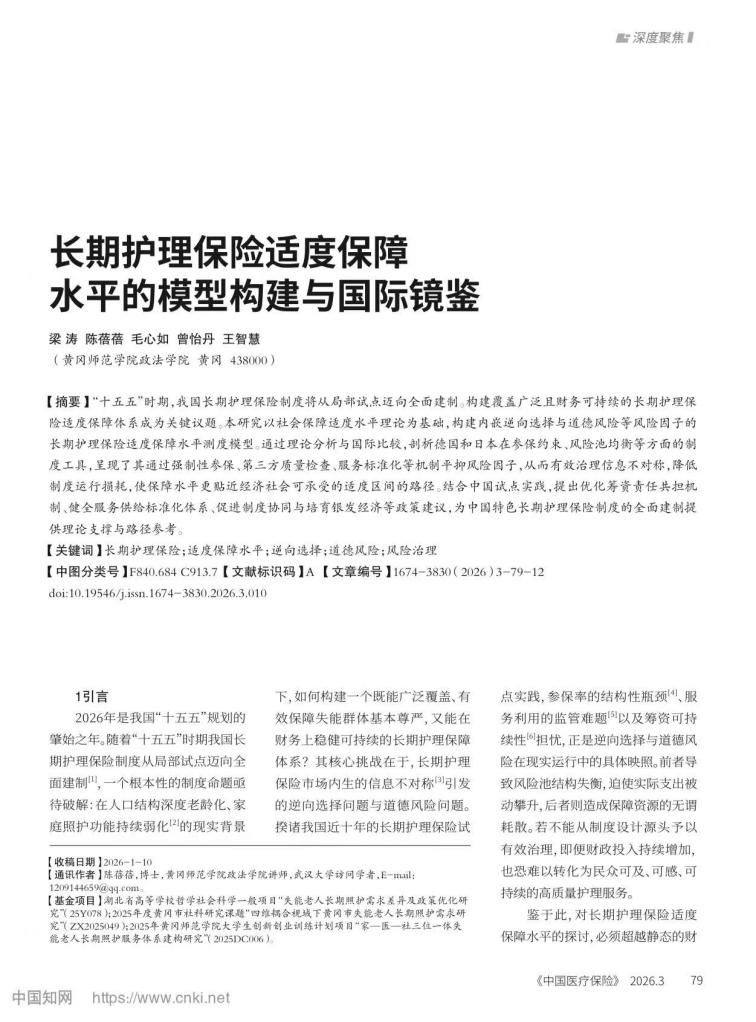 近日,我院社会工作专业师生合作完成的论文《长期护理保险适度保障水平的模型构建与国际镜鉴》,在《中国医疗保险》2026年第3期正式发表。论文作者为我院社会工作专业2023级本科学生梁涛、毛心如、曾怡丹、王智慧。陈蓓蓓老师为论文通讯作者,全程参与了论文的选题构思、框架优化、修改审核与文本润色。